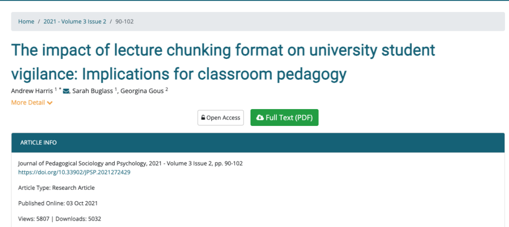 The impact of lecture chunking format on university student vigilance: Implications for classroom pedagogy (Harris et al., 2021)