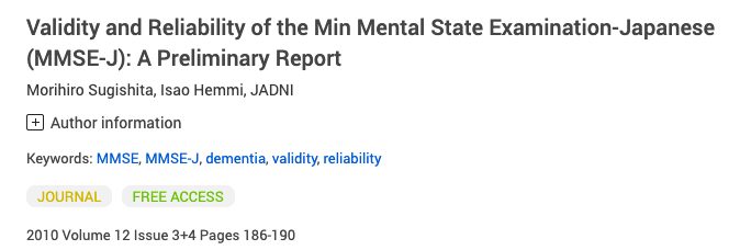 - ミニメンタルステート検査といい「Mini-Mental State Examination(1975年にアメリカでスタートし、日本語の2007年に翻訳されこのスコアの再現性も2010年には認められています)