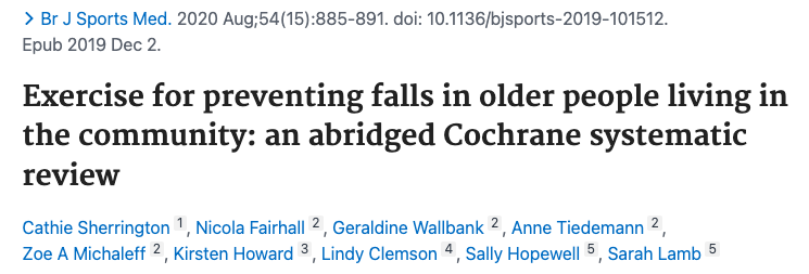 - Sherrington, C., et al. (2019). Exercise for preventing falls in older people living in the community, Cochrane Review